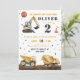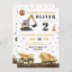 Cette invitation présente une aquarelle illustrant une célébration du 2e anniversaire sur le thème de la construction pour un petit garçon. L'illustration comprend un camion à benne, une pelle, un bulldozer et divers panneaux routiers en jaune, orange, bleu et noir.