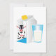 Un verre de lait à côté d'une boîte de lait avec une image de vache dessus. Cette conception semble vraiment efficace sur ces invitations