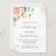 Un arrière - plan blanc décoré de verdure d'eucalyptus, d'or rose et de rose rose rousse, de feuilles dorés et de parties scintillant en faux or scintillent. Personnalisez et le nom et les détails des enfants. Lettres noires et dorées. Retour : arrière - plan blanc avec gouttes de parties scintillant en faux or