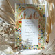 The invitation is framed by an incredibly detailed and colorful border inspired by traditional Moroccan Zellij mosaic tilework. The rich and warm palette of terracotta, ochre, and pink is brilliantly contrasted with deep blues and lush greens, creating a visually captivating and festive design. Your wedding details are elegantly presented in a central panel, using a sophisticated blend of classic serif and script fonts. This invitation is perfect for a destination wedding in Marrakesh, a bohemian-themed celebration, or for any couple wanting a unique and unforgettable announcement.