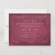 Cette élégante invitation à la fête de fiançailles mariages présente un design de style étiquette de vin vintage. Des croquis rustiques dessinés à la main de feuilles de vigne encadrent les détails de l'événement. Une conception simple et fleurie avec du texte personnalisé apparaît à l'envers. Couleurs rouge bordeaux et rose rose.