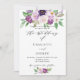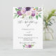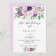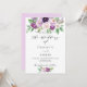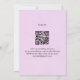 Avant : arrière - plan blanc. Décoré de fleurs violettes et violettes aquarelles et verdure. Personnalisez et ajoutez vos noms et les détails de votre fête. Dos : couleur arrière - plan rose. Ajoutez l'URL de votre site Web mariage au code QR pour plus de détails et/ou RSVP.