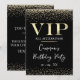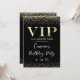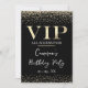 Cette invitation de fête à accès total VIP glamour présente un design sophistiqué sur fond noir. Le titre VIP est imprimé dans une police de style feuille d'or, suivi du titre de l'événement. Une bande de diamants pailletés d'or accentue les parties supérieure et inférieure. Le lieu et l'heure de la fête ou de l'événement sont imprimés au verso. C'est parfait pour un anniversaire, un sweet 16, une douche de mariée ou autre célébration élégante.