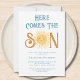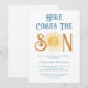 Famille Invitation et amis à votre baby shower sur le thème du soleil avec cette mignonne invitation de baby shower pour garçons de soleil. Il présente le texte "Here Comes The Son" en typographie rétro bleue avec une jolie aquarelle jaune souriante soleil. Facile à personnaliser. Parce que nous créons notre oeuvre, vous ne trouverez pas cette image exacte d'autres designers. Aquarelle originale © Michele Davies.