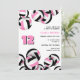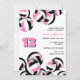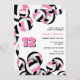 Cette mignonne invitation à la fête de volley-ball pour un anniversaire ou une fête d'équipe comporte des grappes de volley-ball rose, noir et blanc aux bords supérieur et inférieur sur le devant et un seul cluster couvrant le dos de l'invitation - customiser les détails de la fête sur un arrière - plan blanc - par katz_d_zynes