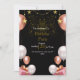 Cette invitation à la fête d'anniversaire a un design luxueux et festif, parfait pour une fête de soirée. L'arrière - plan noir foncé crée un contraste spectaculaire avec les accents roses d'or, de blanc et de rose. Les éléments décoratifs comprennent :