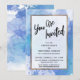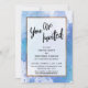 Sur un fond artistique désordonné avec de la peinture éclaboussée dans des nuances de bleu, de violet et de turquoise, j'ai placé un rectangle opaque bordé d'un faux doré métallisé pour mettre en valeur le texte. La partie supérieure comporte un calque de typographie simple qui indique "Vous êtes invité" dans une écriture manuscrite moderne et décontractée. Utilisez les champs du modèle pour ajouter vos propres détails. Toutes les couches ont été ajoutées séparément et laissées déverrouillées pour vous donner le contrôle sur le design. // 105 //