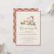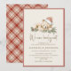 Featuring a charming watercolor teddy bear peacefully sleeping in a Santa hat atop pine boughs and holly, this design perfectly captures the warmth of a winter or Christmas baby shower. The cute bear and greenery are framed by soft, neutral colors and a subtle border, creating a cozy and timeless aesthetic. The playful phrase "We can bearly wait" is written in an elegant, flowing script font. The back of the card features a matching plaid pattern, adding a playful yet cozy vibe to your invitation.