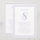 Our trendy wedding table number guest list features a clean template for the table number and the list of guests seated at that table. Personalize elegant lettering and script with your guests’ names and details in soft lavender on a crisp white background. A perfect addition for weddings, anniversaries, or large engagement parties. The reverse side mirrors the front for easy viewing from both directions. Custom color requests welcome.