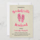 Un mignon invitation de fête de bachelorette pour une escapade de week-end, avec de jolies calligraphies d'aquarelle rose, des sandales de parties scintillant rose, et un arrière - plan de plage, de grains de bois brun clair.