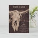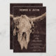 Ces rustiques western uniques 5x7 faire-part de mariage carte plat modèles vous pouvez customiser dispose d'un rodéo cowgirl taureau cow crâne brun pays texture arrière - plan design. Grange style vintage vieux sauvage ouest inspiré cool antique, animal de ferme branché. Rsvp en ligne sur le dos.. Copyright de l'image Marg Seregelyi Photography.
