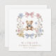 Announce your baby shower with a touch of playful elegance using this charming teddy bear themed invitation. The centerpiece is a delightful teddy bear adorned with a sweet blue bow, surrounded by a beautiful arrangement of pastel flowers and delicate greenery. The elegant script and soft color palette create a sophisticated yet heartwarming feel, perfect for celebrating mom to be's special day. This card is sure to set a joyful tone for your baby shower fun.
