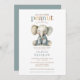 Sweet little peanut theme watercolor elephant enchanting illustration blue baby shower invitation in colored type with the phrase: our sweet little peanut is on the way. Gender neutral. Available in print, as a digital download, or both!