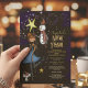 Celebrate the arrival of the New Year with a touch of hand-drawn magic! This boutique New Year's Eve invitation features a charming tall snowman in a top hat, a graceful dancer in a midnight blue gown, and a festive little mouse holding a golden star. Set against a deep, starry purple background with sparkling fireworks and a matching star pattern on the back, it’s an elegant choice for grand ballrooms or intimate cocktail parties.