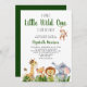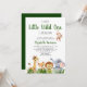 Jolie invitation à la douche de bébé "petit sauvage" avec des illustrations d'aquarelle d'animaux safari (girafe, tigre, lion, éléphant et singe) et "Petit Sauvage Un" et le nom de la mère à être sont dans une écriture verte de forêt.