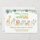 Cette mignonne invitation à l'anniversaire comprend des animaux de safari à l'aquarelle avec des accents de feuilles tropicales et des confettis de feuilles d'or faux.