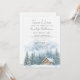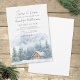 The front features a serene watercolor winter scene with a brown log cabin nestled at the bottom, surrounded by soft green pine trees and blanketed in crisp snow. The clean white sky above leaves plenty of room for your event details in a modern, easy-to-read layout. The overall look is tranquil and elegant, blending rustic charm with seasonal warmth.