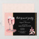 Make her retirement party unforgettable with this stylish and festive invitation design! With a sophisticated two-tone pink & black layout, the left side features a rich pink shade adorned with golden glitters, watercolor champagne glasses, and a bottle that sets the scene for a bubbly celebration. The scripted “Retirement party” adds a touch of glamour and excitement across the card. On the right, the soft pink background offers room for all your personalized party details in a classy script and serif font pairing. The back design continues the elegant theme with a lighter pink base and shimmering glitter details.