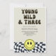 Invitation Wild et trois ans heureux face invitations Cool et amusant enfant Retro thème 3e anniversaire invitation de fête avec des styles rétro Cool avec chèque motif et visage heureuxLe texte dit "jeune, sauvage et trois". Parfait pour la fête d'anniversaire d'un garçon.