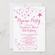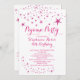 Une jolie invitation à la fête en pyjama pour les filles présente un arrière - plan blanc immaculé contemporain avec l'éclatement de la star rose parties scintillant FAUX. Notre invitation d'anniversaire de fête du sommeil populaire est disponible dans notre boutique dans un choix de couleurs varié et élégant.