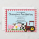 Commencez votre fête anniversaire de enfant avec notre invitation anniversaire de enfant d'animaux de ferme sucrés avec une vache, un cochon, un grille-pain, un mouton, un tracteur d'étable et un poussin pour bébés. Mignonne pour une première fête d'anniversaire pour filles ou pour les premiers garçons. Visitez notre boutique pour voir d'autres invitations à la fête d'anniversaire mignonnes et des notes de remerciements assorties, des autocollants et des timbres-poste. © Design Babystar