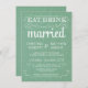Mangez, buvez, et soyez mariés — invitations à des mariages campagnards rustiques de style Vintage — parchemins Tourbillonnant, bouclés et typographie à l'ancienne sur un arrière - plan de burlap vert menthe. Ajoutez vos noms et informations mariages dans ce modèle facile à utiliser. Élégant mais amusant et fantaisiste, l'écriture de script de style tableau de bord peut être modifiée pour votre thème rétro rétro ou formel mariage. Le style moderne Décontracté est parfait pour les mariages contemporains branchés avec une touche amusante de charme sophistiqué pour les mariés et mariés traditionnels. Veuillez nous contacter pour obtenir de l'aide sur la personnalisation si vous avez besoin d'espace supplémentaire pour vos détails mariages. Autres formats et styles de tableau de bord disponibles.
