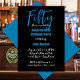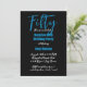 Invitation de fête d'anniversaire de jalon pour un homme. Invitations noires aux couleurs blanches et bleues. Les polices sont des scripts et des imprimés modernes en gras pour le titre du parti et le nom de l'honneur.