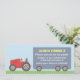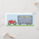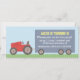 Une longue invitation à la fête d'anniversaire avec un tracteur rouge transportant une remorque bleue. Personnalisez les détails de votre soirée sur l'espace de la remorque ! Idéal pour les garçons d'anniversaire qui aiment les tracteurs !