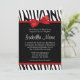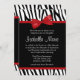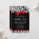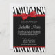 Un motif zèbre noir et blanc tendance avec un arc rouge graphique est présenté sur cette invitation Bat mitzvah amusante. Les dessins sont des illustrations/graphiques imprimés - PAS RÉELLEMENT RIBBON.