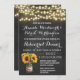 Des invitations de dîner de répétition de tableau de tournesol - comportez les lumières de ficelle et un pot de maçon décoré de la toile de jute et de la dentelle qui est remplie de tournesols au-dessus d'un arrière - plan de tableau. Voyez la collection assortie entière dans cette conception ci-dessous.