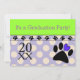Vet Tech Graduation Invitations, pois violets et blancs avec emblème de pattes de chien. Entièrement personnalisable à l'avant et à l'arrière. Parfait pour l'obtention d'un diplôme de technicien vétérinaire.