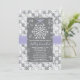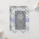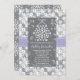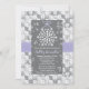 Une belle douche nuptiale à thème ou une invitation wedding shower avec un damas doux, gris et blanc glacé, floral et flocon de neige, avec un motif imprimé en ruban mauve et mauve. Un joli flocon de neige blanc attaché par un délicat arc de lavande est accroché au sommet de la carte avec des reflets de neige en forme de coeur derrière. L'arrière du invitation est recouvert d'un coeur et d'un motif de flocon de neige qui se répètent. Oeuvre © Chrissy H. Studios, LLC. Tous droits réservés.