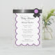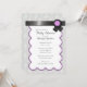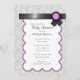 Belles invitations avec un motif en damas gris et blanc de bruyère et un design en ruban noir avec violet au sommet.