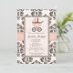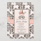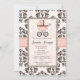 Jolie invitation à la douche de bébé damassée rose et marron avec un design contrasté de ruban de couture et un chariot de bébé rose avec garniture brun foncé. Artisanat et design © Chrissy H. Studios, LLC.Tous droits réservés.