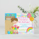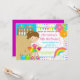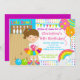 Commencez votre fête d'anniversaire de fille outre de la droite avec notre grève lumineuse et colorée mignonne vers le haut d'une certaine invitation de fête d'anniversaire de bowling d'amusement comportant une fille mignonne de brune à un allié de bowling avec des boules roses et oranges de ballon et de bowling réglées sur un arrière - plan mignon de pois avec l'étamine jaune, vert, de turquoise de bleu, rose et orange. Le dos de l'invitation comporte une couleur pourpre coordonnée. Entièrement personnalisable par vous avec votre information. illustrations de ©JW