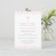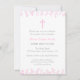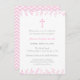 Une invitation moderne et élégante au baptême ou au baptême en rose pastel. Le design a la croix sainte au centre et les feuilles décoratifs pour la frontière. Au verso, un motif zigzag rose et blanc de chevron pastel. Personnalisez facilement avec les détails de l'événement pour le baptême de la petite fille.