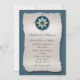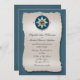 Elégante invitation de mariage nautique vintage avec boussole bleue et papier beige déchirée illustration sur bleu.