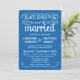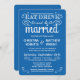 Mangez, buvez, et soyez mariés — invitations à des mariages campagnards rustiques de style Vintage — parchemins Tourbillonnant, bouclés et typographie à l'ancienne dans un texte blanc éblouissant sur l'arrière - plan bleu outremer de l'océan Pacifique. Ajoutez les noms de mariée et de mariée et les informations mariages dans ce modèle facile à utiliser. La calligraphie de style craie rétro, élégante mais amusante, et fantaisiste, peut être modifiée pour votre thème mariage formel ou semi-formel. Le style moderne Décontracté convient parfaitement aux mariages contemporains branchés avec une touche de charme sophistiquée pour les couples traditionnels. Veuillez nous contacter pour obtenir de l'aide sur la personnalisation si vous avez besoin d'espace supplémentaire pour vos détails mariages.IMPORTANT : Affiché sur les cartes d'invitation standard de la taille A7. Autres formats et styles disponibles, ainsi que des invitations assorties, timbres-poste, accessoires de coordination et services de douche.