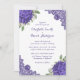 Invitations de mariage d'hydrangée bleu rustique avec des fleurs d'hydrangée violette, respiration et verdure pour bébé sur un arrière - plan blanc uni décoré de dentelle fleurie violette.
