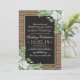 Cartes d'invitation de mariage modernes et fraîches avec verdure, comportant un fond en bois rustique, un centre de tableau en ardoise noire, de la corde, un ensemble de feuillage vert avec quelques fleurs blanches élégantes et un modèle de mariage classique.