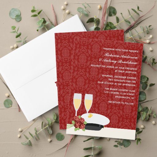 Cette faire-part de mariage entièrement personnalisable présente une belle illustration d'un uniforme militaire et d'une robe mariage. Couleurs personnalisées disponibles sur demande. Art by Heartlocks Designs. Quelques éléments de conception © Cocoa Studio