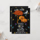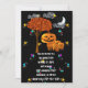 Invitation d'Halloween pour enfants, enfants ou familles avec ciel noir, lune de croissant, nuages et étoiles plus colorées abondent. Famille Citrouille mignonne debout à côté d'un arbre avec des Feuilles couleur chute orange et un Big BOO! Les yeux au-dessus des lettres vous invitent à une fête d'Halloween la plus éffrayante, mais pas trop. Parfait pour la fête d'Halloween de la récolte de l'église aussi !