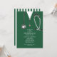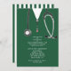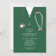 Invitations de la fête de remise des diplômes de l'école de médecine créative mettant en vedette des gommages d'hôpitaux verts et du stéthoscope. Modifiez le texte pour créer une invitation unique pour un médecin.
