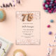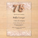 Une invitation moderne, élégante et glamour pour une fête de 75ème anniversaire. Un arrière - plan clair et transparent avec des confettis roses en or. Le nom est écrit avec un script de style moderne écrit à la main. Personnalisez et ajoutez les détails de votre fête. Le numéro 75 est écrit avec une police de style ballon, script.