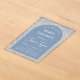 Une invitation baby shower bleue pour bébé garçon, qui combine l'ancien et le nouveau : une arche bleue moderne sur un motif floral bleu vintage sur arrière - plan transparent. Le nom est écrit en script. Le texte est blanc, à l'intérieur de l'arc bleu. L'arrière - plan est un vintage Morris floral bleu du 19ème siècle motif : "Merton" de Kate Faulkner, de 1888, maintenant dans le domaine public.