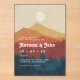Un faire-part de mariage acrylique de style rétro pour votre mariage de montagne ou de forêt. Ce design présente une illustration subtilement en détresse d'un paysage de montagne et de forêt dans un effet ombre jaune, orange et bleu marine, superposé avec vos détails mariages en blanc rétro.