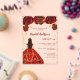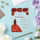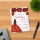 Une invitation moderne, élégante et glamour pour une fête Sweet 16, 16e anniversaire. Un arrière - plan clair et transparent avec une parties scintillant en faux or, une fille portant une robe rouge et or et des roses rouges, des fleurs. Le nom est écrit avec un script de style moderne écrit à la main. Personnalisez et ajoutez les détails de votre fête.