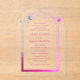 Celestial rose Sun Moon Stars Galaxy Space Mariage acrylique Invitations dispose d'un soleil rose et violet, lune et étoiles sur un arrière - plan acrylique opaque. À l'intérieur, vous trouverez vos informations d'invitation de mariage personnalisées. Personnalisez en modifiant le texte dans les zones de texte. Conçu pour vous par Evco Studio www.zazzle.com/store/evcostudio