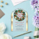 Cette belle invitation de Noël en forme d'arc et de bandes latérales dorées est très tendance. La couronne est décorée de cônes de pin, de boules saintes, rouges et blanches, d'étoiles dorées et de flocons de neige. Tous les textes sont écrits avec une typographie raffinée et sont personnalisables. Parfait pour un joyeux Noël moderne !
