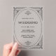 Ces invitations de mariage en acrylique clair et séduisantes présentent une touche moderne sur l'art déco classique. Un cadre et une ornementation géométriques noirs ornés décorent un arrière - plan clair pour un look de mariage vintage et spectaculaire.